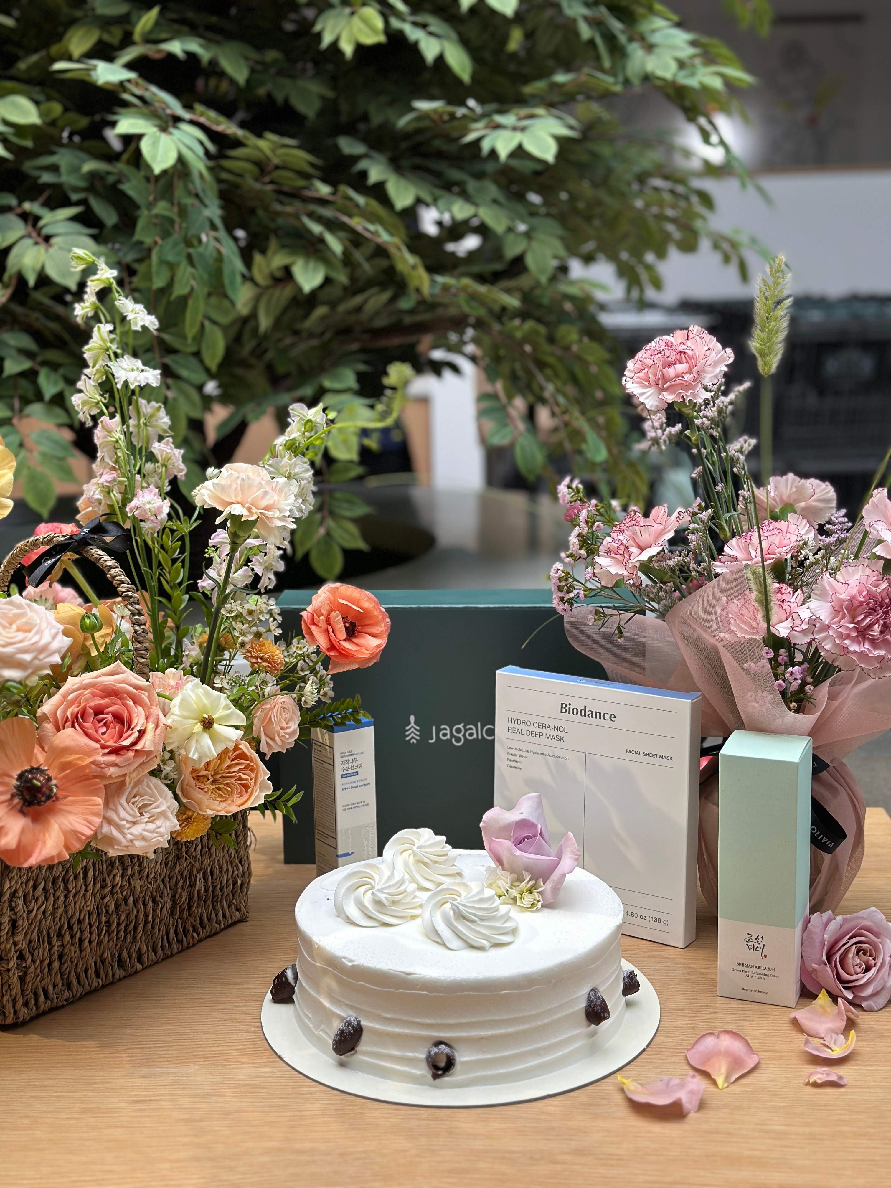 This event was a collaborative effort between Jagalchi and OliviaSF, featuring a partnership with a local florist known for high-quality, beautifully arranged flowers. The concept combined skincare sets with fresh floral toppings on our cakes for Basquia Bakery, creating a unique and visually stunning experience.